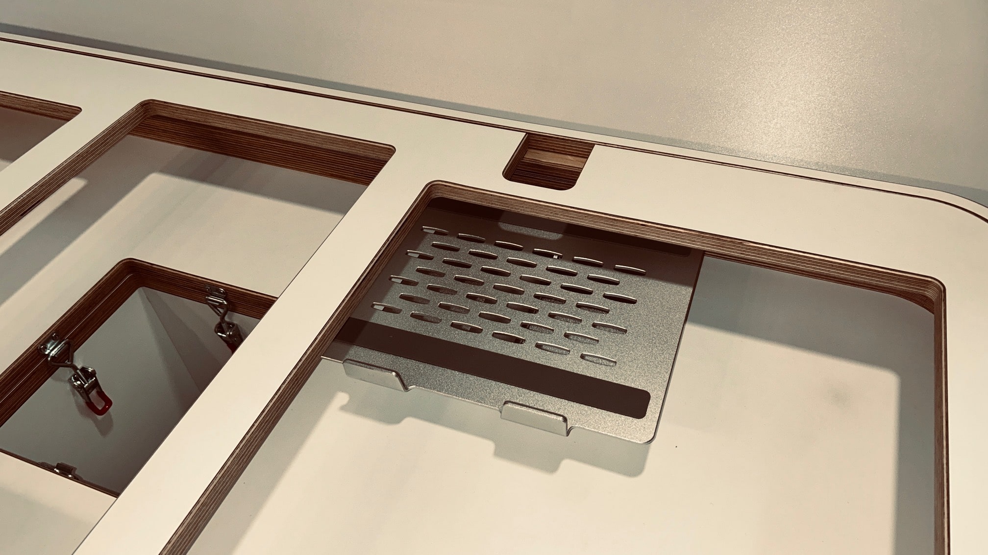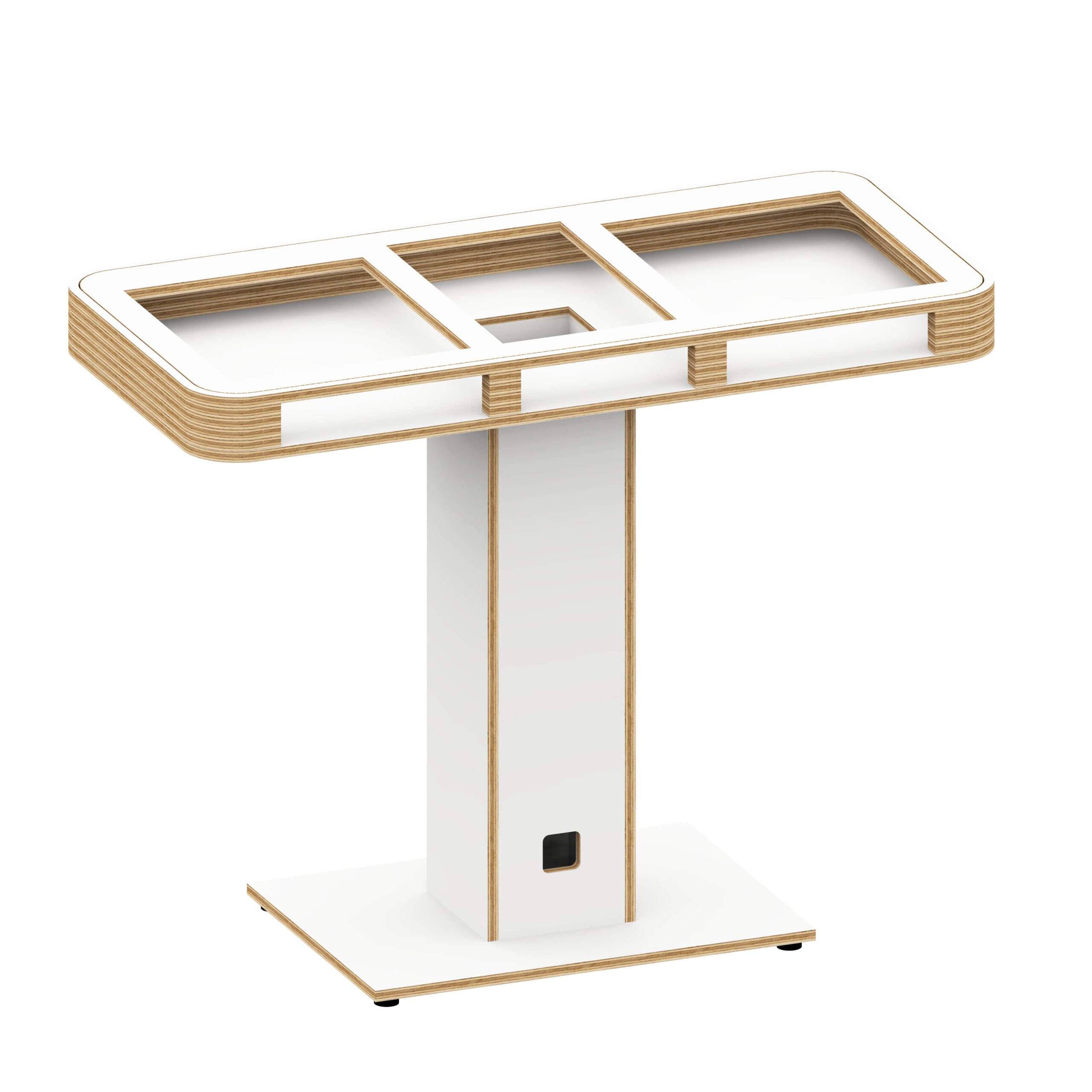 Der Modulare DJ-Controller-Desk M4 vereint durchdachte Funktionalität mit hochwertigem Design und ist speziell für professionelle Anwendungen konzipiert. Mit einer großzügigen Arbeitsfläche von 1285 mm Breite und 600 mm Tiefe sowie einer komfortablen Höhe von 1015 mm bietet er optimale Ergonomie für den Live-Einsatz und das Studio. Gefertigt aus robustem Multiplex und beschichtet mit 0,6 mm CPL, überzeugt der Desk durch seine langlebige Oberfläche und die edel matt lackierten Sichtkanten mit 2K-Purlack. Die stabile Bodenplatte ist mit vier runden Gummifüßen ausgestattet, die für sicheren Stand und Vibrationsdämpfung sorgen. Das Deck ist flexibel anpassbar und eignet sich für verschiedene Controller-Formate, wodurch maximale Kompatibilität gewährleistet ist. Die Konstruktion ist in vier Teile zerlegbar und lässt sich dank hochwertiger Edelstahl-Spannverschlüsse mit Hebelmechanik schnell und werkzeuglos montieren. Eine fest integrierte, klappbare Laptophalterung sorgt für platzsparende Organisation, während die benutzerfreundliche Kabelführung eine saubere und effiziente Verbindung aller Komponenten ermöglicht. Dieses Möbelstück ist die ideale Lösung für DJs, die Wert auf Präzision, Mobilität und ein ästhetisches Setup legen. Ohne E-Geräte!